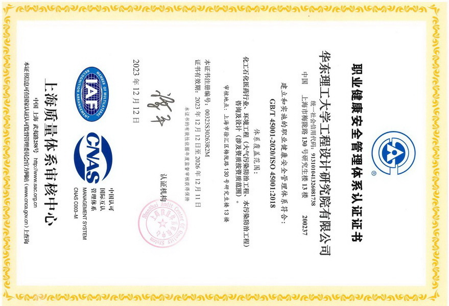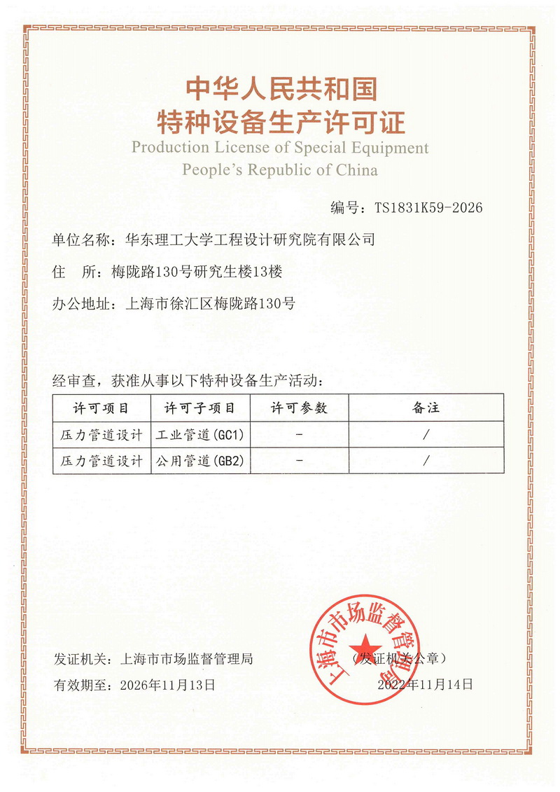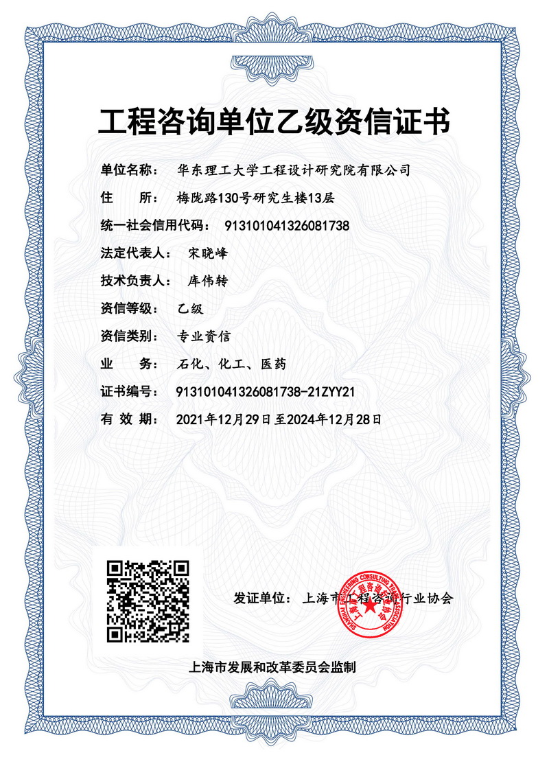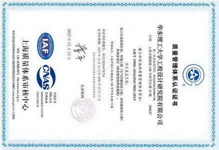 目前公司拥有上海市住建委颁发的工程设计资质,包括化工石化医药行业(化工工程、石油及化工产品储运、生化、生物药)专业甲级、环境工程(水污染防治工程、大气污染防治工程)专项甲级、建筑行业(建筑工程)乙级及相应建设工程总承包能力同时具有上海市工程咨询行业协会颁发的石化、化工、医药工程咨询乙级资信和上海市市场监督管理局颁发的 GC1 和 GB2 压力管道设计许可证,公司通过了 ISO9001 质 量体系认证,公司先后完成了大小设计项目 2000 余项。